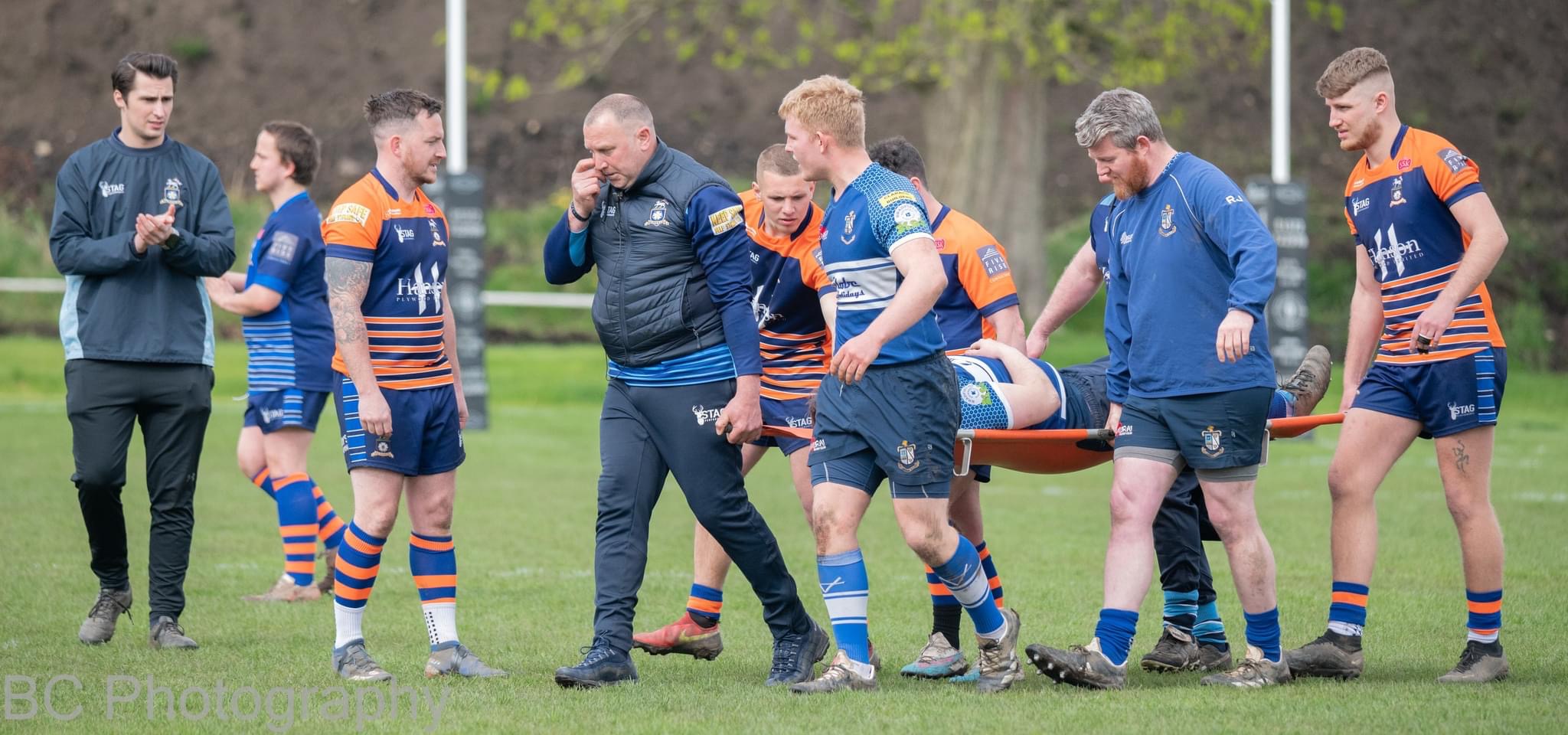 A broken fibula & dislocated ankle for popular hooker Mikey ‘vegas’ Hartley marred the final encounter of a much improved season for Globe Holidays sponsored Stocksbridge Rugby, as they were eventually beaten by promoted Halifax RUFC by 52pts to 24pts. Stocksbridge travelled more in hope than in expectation, with veteran kicker Scotty Bowskill restored to the fly half berth, & the fit again Ben Tyers marshalling a youthful looking back line with both Logan Hannah & Harvey Norman included from the start against a powerful, robust & confident Halifax outfit. Wily Head Coach Andy Lawrence, produced a cunning game plan to upset the Halifax promotion party, & there was success as the home side seemed to lose their discipline almost from the first whistle, conceding a high number of penalties which allowed Stocksbridge to nudge their way up field. Halifax received a total of 4 yellow cards for their misdemeanours & were lucky not to receive a straight red for a poorly timed high shot on flying winger Hannah towards the end of the clash. Stocksbridge rattled their high flying opposition early on, with ‘clock tower’ Beal handing out some punishing hits in defence, one in particular silenced the vocal home scrum half, much to the joy of the travelling band of Stocksbridge supporters. The visitors even took the lead when Bowskill converted a 30 metre penalty for a ruck infringement, before the luckless Hartley suffered his injury in a rather innocuous looking challenge & play was suspended while the medics looked after the stricken hooker. Young Joe ‘half pint’ Martin jnr taking his place in the front row. Although Stocksbridge defended well in parts, & cleared their lines when the home side infringed, there was always a threat when the pacey Halifax backs were on the ball, & the blue line was eventually breached as ‘Fax’ ran in two tries before the break to leave the half time score: Halifax RUFC 14pts – Stocksbridge Rugby 3pts.